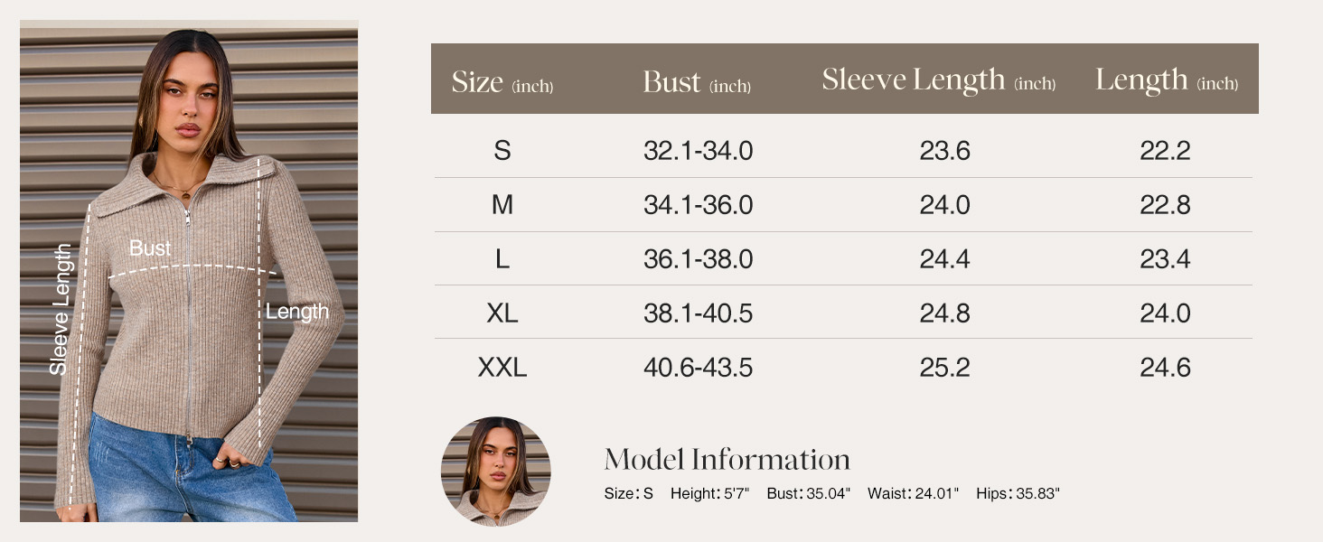 Fall Long Sleeve Cardigan Size Chart - Slim Fit