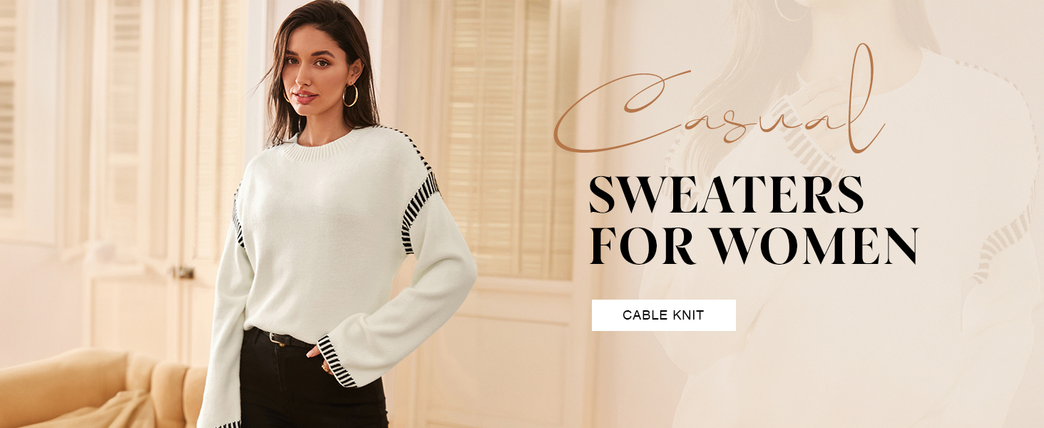 • Dokotoo Sweaters for Women Fashion Solid Crewneck Loose Fit Long Sleeve Contrast Cable Knit Pullover Sweater Jumper Tops