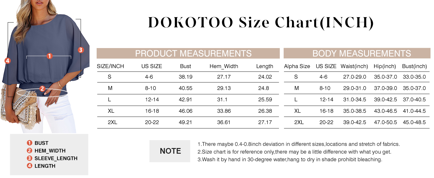 • Dokotoo Women Blouses Dressy Casual 3/4 Length Sleeve Womens Tops Boat Neck Batwing Dolman Top