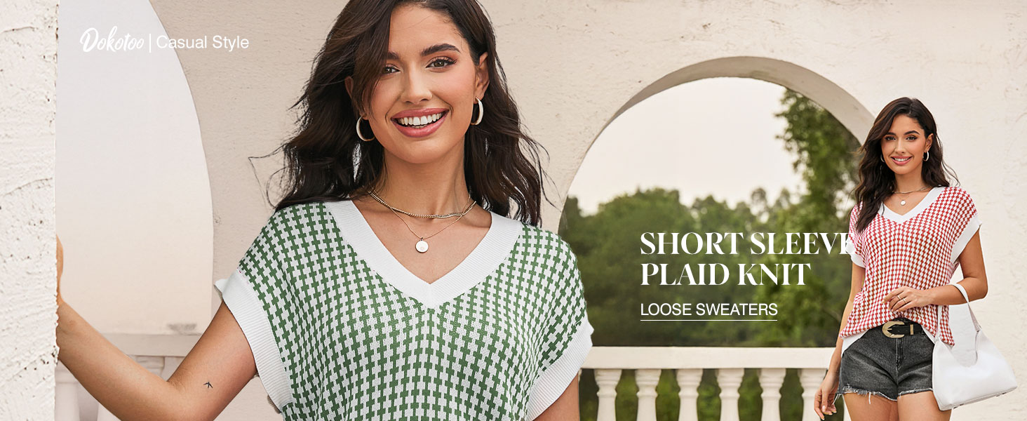 • Dokotoo Womens Casual Summer Tops V Neck Short Sleeve Plaid Knit Vest Loose Fit Pullover Sweaters Blouses