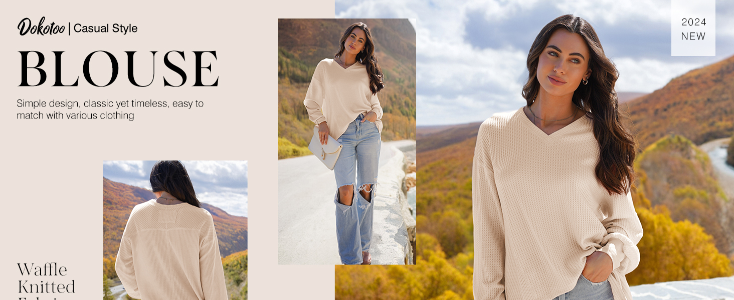 • Dokotoo Womens Waffle Knit Tops Fashion 2025 Long Lantern Sleeve Casual Blouses V Neck Oversized T Shirts